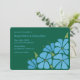 Flores grandes, arrojadas e estilizadas, azuis-céu suportam detalhes de casamento em um verde-caçador rico — ou uma cor complementar da paleta de cores de seu casamento.