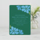 Flores grandes, arrojadas e estilizadas, azuis-céu suportam detalhes de casamento em um verde-caçador rico — ou uma cor complementar da paleta de cores de seu casamento.