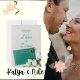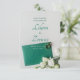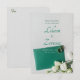 Um convite de casamento de papel ultra grosso cor prateada com nome dos noivos, imagem de envelope verde e uma flor de um lado para este design.