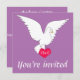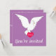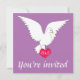Este maravilhoso convite para o casamento mostra uma pomba branca num maravilhoso fundo de orquídea radiante que é uma bela procura por um casamento. A pomba também se prende a um amor vermelho ouvido que tem iniciais que podem ser personalizadas para serem as iniciais da noiva e do noivo e é um toque romântico na frente do convite. A parte de trás do convite é um simples fundo de cor orquídea radiante com todos os detalhes do evento feliz em escrevendo branco.