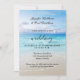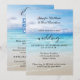 Um convite de casamento com uma pintura moderna de uma praia em cores vibrantes. No verso, há um modelo de código QR para os detalhes do seu site e para confirmar presença.