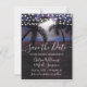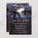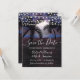 Convite de casamento de praia nas noites de verão para salvar a data. Oceano, areia e luzes e palmeiras sob uma lua cheia. Conjunto de convite de casamento com tema de praia sutil em roxo e azul.