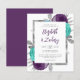Este design apresenta buquês exuberantes de flores roxas, teais, turquesas e prateadas que enfeitam uma estrutura retangular de folha de folhas prateadas. Personalize o texto em um fundo branco com os primeiros nomes da noiva e do noivo em um roteiro de escrita manual roxo moderno, com a data, a hora e o local do casamento em cinzas de carvão serif. A parte traseira da placa é uma sombra equivalente de roxo sólido.