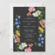 Um moody convite de casamento que apresenta um quadro retangular sobre grandes flores aquáticas em azul, amarelo, branco, vermelho e rosa sobre um fundo de carvão.