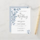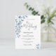 Um convite de casamento em branco e azul empoeirado. Um fundo branco chic na frente. Decorados com prigos e folhagem azuis botânicos. Escrita moderna e extensa, tipografia com o texto: O casamento de... Modelos para nomes e detalhes do casamento. Texto das cinzas escuras. Fundo: fundo azul empoeirado. Dica: Se você não quiser que pareça um cartão postal, clique em personalizar, vá para o verso e remova o divisor e o carimbo de posto.