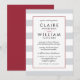 Misturando elementos modernos e tradicionais, nosso convite para o casamento Metro Stripe oferece estilo clássico em uma paleta colorida de cinza vermelha e pálida de morango com letras negras nítidas. Largas faixas horizontais em cinzas e quadro branco seus detalhes de casamento em uma mistura de blocos modernos e tipos tradicionais de script. Uma borda fina em vermelho rico adiciona um contraste inesperado para um pop de cor. Cartões invertidos a vermelhos sólidos. Perfeito para casamentos de inverno ou de férias.