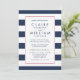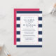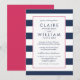 Misturando elementos modernos e tradicionais, nosso convite para o casamento Metro Stripe oferece um estilo clássico de pré-disquete em uma paleta de cores brilhantes de azul e branco marinho com pop de cor rosa vibrante de fúchsia. Largas faixas horizontais no quadro marinho e branco seus detalhes de casamento em uma mistura de blocos modernos e tipos tradicionais de script em marinho correspondente. Uma borda fina em rosa claro adiciona um pop de cor inesperado, mas sutil. Cartões invertidos a rosas sólidas.