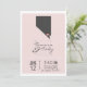 Um convite de casamento branco e cor-de-rosa, apresentando uma cinza Las Vegas, uma silhueta de Nevada com coração. A parte de trás do convite tem um simples design cor-de-rosa.