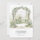 Um convite de casamento botânico ao ar livre, elegante, de boho floral, em tons brancos e verdes, com uma bela fonte de estilo antiga inspirada nas inscrições romanas do primeiro século. Perfeito para primavera, verão ou casamento outono. Branco na parte de trás.