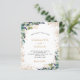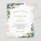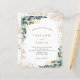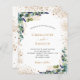 Um fundo branco decorado com verde de eucalipto e folhagem de ouro. Personalize e adicione seus nomes e detalhes do casamento. Letras pretas e ouros coloridas.