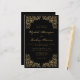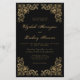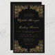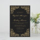 Este elegante convite de casamento inspirado na vintage apresenta uma folha de acanthus de cor dourada ornamentado e uma flor de lis design em quatro cantos num fundo preto. O texto personalizável combina um script dourado com fontes serif e itálico. O reverso é preto sólido.