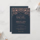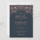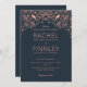 Um convite de casamento azul marinho com tema escuro com motivo coral ou dourado rosa, filigrana intrincada e padrões botânicos criam um design sofisticado, jardim da meia-noite.