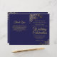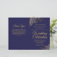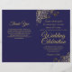 Esta combinação de convite de casamento e programa apresenta um design elegante em azul naval e dourado com caracóis e espirais delicados de pseudo-folha de ouro nos cantos. A frente apresenta o convite, enquanto o interior contém os detalhes da cerimônia e da festa. A parte traseira tem espaço para uma nota de agradecimento.