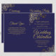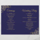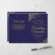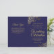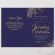 Esta combinação de convite de casamento e programa apresenta um design elegante em azul naval e dourado com delicadas curvas e espirais de pseudo-folha metálica nos cantos. A frente apresenta o convite, enquanto o interior contém os detalhes da cerimônia e da festa. A parte traseira tem espaço para uma nota de agradecimento.