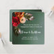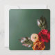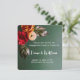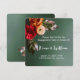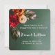 Este convite de casamento quadrado e elegante apresenta uma bela composição de flores e folhas outonais contra um fundo verde profundo. As cores vibrantes de burgundy, pêssego e verde criam uma atmosfera quente e convidativa, perfeita para um casamento de outono. O design minimalista permite que a composição floral seja o centro das atenções, enquanto o texto personalizável garante um toque pessoal.