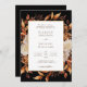 Folhas de outono | Convite para Casamento Negro Elegante. Este elegante convite para o casamento contém lindas rosas pintadas à mão, cor d'água queimada, laranja e folhas de terracota, creme e beige, e belas ferrugem e marrom sobre fundo preto, perfeito para um casamento no outono! A parte de trás do convite tem um belo galho de folhas com a noiva e o monograma do noivo. Localize itens correspondentes na Coleção de Casamentos Romance de outono Preto.