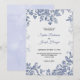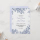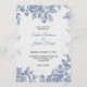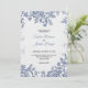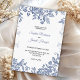 Convite de casamento elegante com bordas florais azuis em fundo branco, apresentando texto cursivo gracioso. Design simples, clássico e sofisticado.