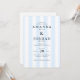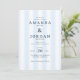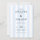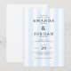 Este convite de casamento apresenta um layout vertical com listras verticais azuis claras e brancas, criando uma atmosfera aérea e elegante. O design utiliza uma fonte serifada clássica em azul-marinho escuro para o texto, que é alinhado centralmente para manter o equilíbrio. A paleta de cores azul-céu pálido e branco puro transmite frescor e sofisticação, tornando-o perfeito para uma celebração formal. Elementos personalizáveis permitem a personalização de nomes, datas e locais, enquanto o estilo geral exala alegria e expectativa para a ocasião especial.