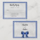 Um fundo com aparência metálica prateada falsa, decorado com purpurina falsa cintilante. Decorado com molduras azul royal e um laço nas costas. Personalize e adicione a data de resposta e seus nomes.