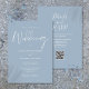Este convite de casamento em azul poeira com letra elegante pode ser personalizado com suas informações em tipografia sofisticada, com os detalhes do seu site de casamento e seu código QR no verso. Criado por Thisisnotme©