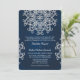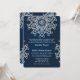 Um convite de casamento em tom de joia azul escuro e safira com um visual prateado falso e um padrão de medalhão de sari ornamental exótico inspirado na Índia COM UM DESIGN DE EXPLOSÃO SOLAR DE FLOR DE LÓTUS. Este convite de casamento em estilo indiano moderno e elegante é perfeito para qualquer ocasião formal COM UM TEMA DE NOITES ARÁBICAS, ALADIM, MARROQUINO OU INDONÉSIO DA ÁSIA ORIENTAL. Projetado por Chrissy H. Studios, LLC. Todos os direitos reservados.