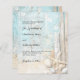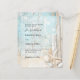 Um convite de casamento rústico de praia com madeira flutuante, concha e areia. Cores azul e bege. Personalize e adicione seus nomes e detalhes.