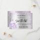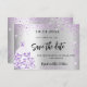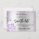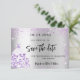 Um fundo moderno com aparência prateada decorado com purpurina falsa roxa, brilhos e um vestido. Personalize e adicione uma data e nomes. O texto: Salve a Data é escrito com um estilo de letra manuscrita grande e moderno.