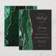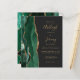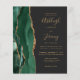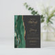 A borda esquerda deste elegante convite de casamento moderno apresenta uma borda de água-marinha esmeralda verde com brilho dourado falso. O texto personalizável combina escrita à mão em cor dourada, fontes copperplate e itálico em um fundo cinza carvão escuro. O verso apresenta um design de ágata esmeralda verde e dourado correspondente.