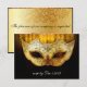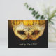 Convite de Casamento Fantasia com Floreios em Dourado. Um cartão de RSVP de máscara de fantasia sofisticado e elegante para todos os seus convidados saberem se irão ou não ao seu casamento. A máscara é apresentada aqui em tons dourados com floreios pretos sobre ela e um fundo com floreios em tons dourados e preto.