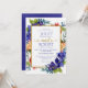 Arranjo floral de aquarelas de flores azuis/púrpuras profundas complementado com flores vermelhas com uma estrutura de ouro brilhante. Um guião de ouro complementar "e" com corações para soar sua união. Lado de trás roxo. Todos os tipos são personalizáveis.