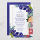 Disposição floral de aquarelas de flores azuis/roxas profundas complementadas com flores vermelhas com uma estrutura retangular dourada. Cor de água azul/púrpura completa. Todos os tipos são personalizáveis.
