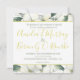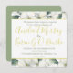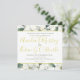 Convite de casamento moderno com flor de corniso em aquarelas suaves de verde-sage, cinza e ocre amarelo.