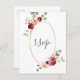 Cartão de RSVP de casamento apresenta uma peça central oval geométrica com flores bordô e eucalipto.