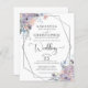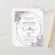 Belo convite de casamento econômico impresso na primavera ou verão em papel leve com buquês florais boho de flores silvestres em aquarela pastel em tons de roxo, violeta, lilás, lavanda, azul poeirento, pêssego, rosa rosado e verde musgo e acentuado com tipografia e texto em escrita carvão cinza e uma moldura geométrica prata cinza. Ideal para entrega manual aos convidados. Entre em contato com o designer via Zazzle Chat ou makeitaboutyoustore@gmail.com se você gostaria que este design fosse modificado ou estivesse em outro produto.
