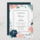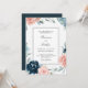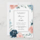 Um belo convite para o casamento num esquema popular de cor rosa e azul-da-meia-noite, este convite dá o tom para uma encantadora celebração. Buquês adoráveis de rosas de aquarelas e flores mistas em azul-rosa e azul-da-noite com verde à direita e elementos esboços enquadram seu texto de convite lindamente. Um fino quadro com dupla linha envolve o texto para adicionar elegância ao convite. Personalize o texto com seus detalhes de casamento.
