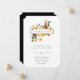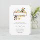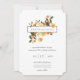 Design de tipografia chic e moderno, convite de casamento que apresenta um buquê botânico de aquarela de frutas cítricas laranja e flores. A parte traseira do convite apresenta cor preta sólida.