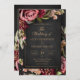 Um convite para o casamento floral clássico, escura e moody. Perfeito para o tema do casamento noturno. Florais e folhagem com sombras e tons dusky. Este convite apresenta um fundo preto com uma fonte serif de eterno ouro realçada por uma fonte de script elegante, também na mesma matiz de ouro. Convite De Casamento Floral De Inverno Negro.