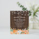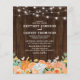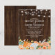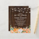 Convite de casamento de outono econômico com fundo de madeira rústica, luzes de corda charmosas de quintal, flores de aquarela elegantes em laranja e branco de outono e um modelo de celebração de casamento fácil de personalizar.