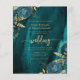 Este elegante convite para o casamento apresenta buquês florais azuis de cor azul saltados com verde folha de ouro em dois cantos, em uma imagem de fundo de um agate de cor de água lacrimogênea. O texto personalizável combina fontes de serifa, itálico e escrita manual douradas. O verso apresenta um chalé e um design de ouro e floral e agate.