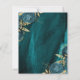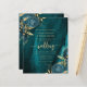 Este elegante convite para o casamento apresenta buquês florais azuis de cor azul saltados com verde folha de ouro em dois cantos, em uma imagem de fundo de um agate de cor de água lacrimogênea. O texto personalizável combina fontes de serifa, itálico e escrita manual douradas. O verso apresenta um chalé e um design de ouro e floral e agate.