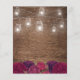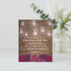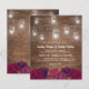 Convites de casamento rústico country econômicos apresentando fundo de madeira, flores de marsala burgundy vermelhas, potes de pedra com luzes de corda e um modelo de casamento editável elegante.
