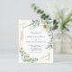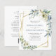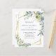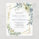 Convite de Casamento com Moldura Geométrica Dourada com Florais de Eucalipto em Azul Poeira "Tudo em Um"... Nosso convite de casamento floral "Tudo em Um" exclusivo e acessível apresenta arranjos elegantes de florais em aquarela e eucalipto em branco e tons de azul poeira em uma moldura geométrica dourada que cerca o texto do convite. O verso do convite contém todos os detalhes que você normalmente veria em cartões separados dentro do pacote de casamento. Este convite de casamento moderno com frente e verso foi projetado para ser elegante e consciente do orçamento... sem mencionar economia de tempo. No verso, há também um modelo de código QR gráfico que você pode substituir pelo seu próprio código (ou excluir se não planeja usá-lo... além disso, não se esqueça de excluir o texto que se refere às informações do código QR). Todo o texto de exemplo pode ser facilmente revisado com suas próprias informações no modelo de personalização