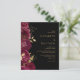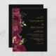 Este convite romântico de casamento floral mostra uma fronteira de flores de burgundy disparadas com folhas de folhas falsas de ouro. Os nomes do casal aparecem em fontes clássicas de serifa dourada, com o texto restante em itálico, em fundo preto.