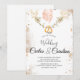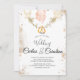 Um convite de casamento lindamente projetado com uma disposição floral romântica em tons suaves de branco e bege, folhagens delicadas e anéis de casamento dourados. A fonte de letra elegante e sofisticada adiciona um toque atemporal e sofisticado, tornando-o perfeito para o seu casamento dos sonhos. Totalmente personalizável com seus nomes, data e detalhes do local.