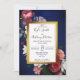 Rosas borgonhentos flores sage greenery marinho azul fundo de ouro quadro de ouro floral modelo de convite para casamento com código QR RSVP no verso.