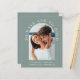 Convite de casamento verde sage moderno e econômico, apresentando sua foto em uma moldura arqueada, rodeada por "Para Ter e Para Guardar" em tipografia branca elegante e seus primeiros nomes, data e local do casamento. No verso, personalize seu convite em tipografia branca simples.