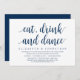 Convite de casamento furtivo moderno em tom de azul navy sofisticado (Coma, Beba e Dance). É perfeito para o seu jantar de casamento casual à beira do lago, dança e festa.