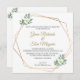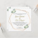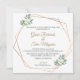 Um belo e elegante convite para o casamento. Com um quadro geométrico dourado e elementos florais e verdes, este convite tem um design espantoso que certamente impressiona os seus amigos e familiares.