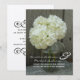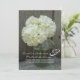 Um convite de casamento com uma foto na frente de um pote de híbridos sobre um pano de fundo de madeira. Personalize o texto na frente e atrás com detalhes da sua ocasião. A redação é da noiva e do noivo.