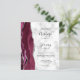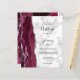 A borda esquerda deste elegante convite de casamento moderno apresenta uma cor d'água borrifada com borda cortada com cintilação falsa de prata. O texto personalizável combina manuscritos, copperplate e fontes itálicas em preto em uma cinza e fundo de mármore branco. O lado inverso apresenta um design de burgundy e agate prateado.